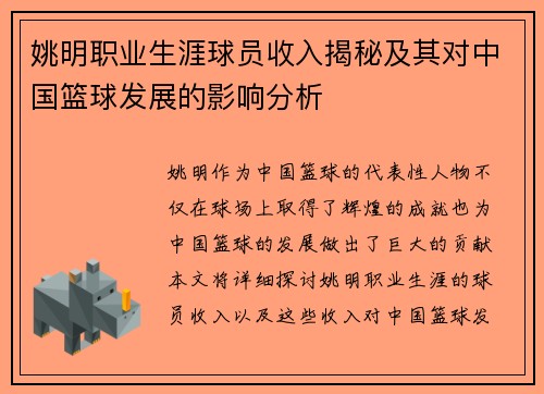 姚明,这位篮球巨星不仅以其卓越的球技和高大的身材在NBA取得了辉煌的成就,更在退役后成为了中美文化交流的重要桥梁。他的传奇人生从一个普通的中国篮球少年开始,经过不懈努力,最终成为世界篮球舞台上的明星。在这篇文章中,我们将从几个方面深入探讨姚明的影响力,包括他在体育领域的贡献、对文化交流的推动、公益事业的发展以及他在国际形象塑造中的角色。每一个方面都体现出姚明作为一名运动员与社会活动家的双重身份,展...